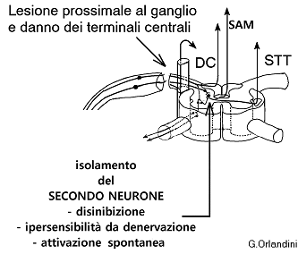 Assieme alla degenerazione dei terminali centrali, la lesione nervosa nel ganglio o prossimale al ganglio comporta nel secondo neurone la disinibizione, l’ipersensibilità da denervazione e l’attivazione spontanea del secondo neurone.Considerato quanto precede, l’elemento cruciale nella patogenesi del dolore da deafferentazione è la scarica spontanea epilettiforme prima a livello midollare e in seguito, forse, anche talamico 24 e corticale.25 Un altro elemento da tenere presente è che (come nel dolore da neuropatia assonale) l’attività elettrica che si produce in questo modo nel midollo spinale non è veicolata soltanto dalle vie del quadrante anterolaterale del midollo spinale (lemnisco spinale) che conducono la nocicezione normale ma, mancando l’attivazione da parte delle fibre C dell’interneurone inibitorio del SAM, anche da quest’ultimo.